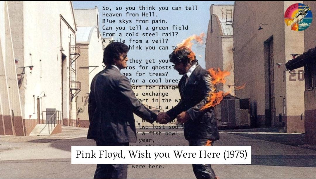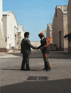 Nella celebre copertina del disco due uomini in giacca e cravatta si stringono la mano, ma uno dei due è in preda alle fiamme: sta bruciando, proprio come Syd Barrett e tanti altri artisti che come lui non hanno saputo opporre resistenza alle logiche dello star system. O magari l’uomo che brucia era, in quel lontano 1975, figura dei tempi che sarebbero venuti, cattivi e cinici: year after year/running over the same old ground/What have we found?/The same old fears, come tutte le grandi opere d’arte visionarie Wish You Were Here ha saputo guardare avanti e dirci cosa saremmo diventati. E non è un bel vedere…