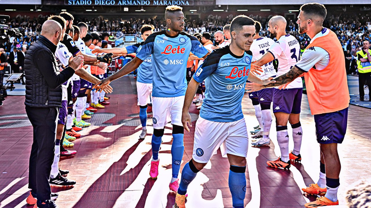 La partita è stata un intermezzo, i momenti significativi della festa per lo scudetto al “Maradona” si sono registrati prima e dopo il match con la Fiorentina. Infatti, al loro ingresso sul terreno di gioco, i calciatori azzurri sono stati accolti da tutti gli avversari, panchinari inclusi, che si sono schierati su due file parallele per rendere omaggio ai neocampioni d’Italia. Un “pasillo de honor” che ha emozionato tutto il pubblico accorso ad affollare gli spalti dello stadio di Fuorigrotta, anche Spalletti, abbracciato dal tecnico viola Italiano, ne è rimasto visibilmente colpito. L’altro episodio chiave dopo il fischio finale, quando tutti tifosi hanno intonato senza sosta “Un giorno all’improvviso” per accompagnare il giro di campo di tutta la squadra, compreso Lozano, uscito per infortunio ma portato ugualmente in trionfo a cavalcioni da un membro dello staff atletico. A quel punto, tra canti, balli, applausi, cori ed emozioni irripetibili, la cronaca della gara diventava davvero secondaria.