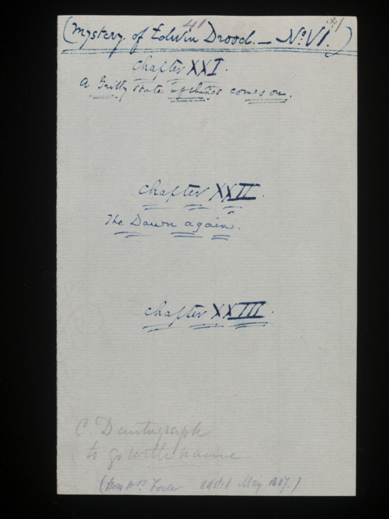 Concludendo, l’incompiutezza di The Mistery of Edwin Drood non è solo la condizione materiale di questo romanzo, ma il suo vero significato: la storia rimane aperta perché racconta un mondo che non si lascia più ricomporre ed un uomo che non è più uno, ma diviso. Il mistero non si chiude perché non riguarda soltanto un delitto, ma l’identità stessa dei personaggi e la possibilità di distinguere il bene dal male. Così il romanzo continua a parlarci proprio attraverso ciò che gli manca: un finale, una verità unica, una riconciliazione. Nell’ombra lasciata dall’incompiutezza e nel gioco inquietante del doppio, Dickens consegna al lettore un enigma che non chiede soluzione, ma interpretazione.