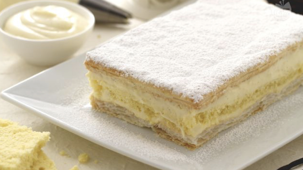 Disponete un pezzo della sfoglia con la parte dello zucchero cristallizzato verso l’alto. Applicate con una sacca a poche la crema e sopra di essa mettete il pan di Spagna precedentemente ritagliato a dovere. Applicate la bagna e sopra di essa altra crema e infine l’altro pezzo di sfoglia con la parte impermeabile rivolta verso la crema.