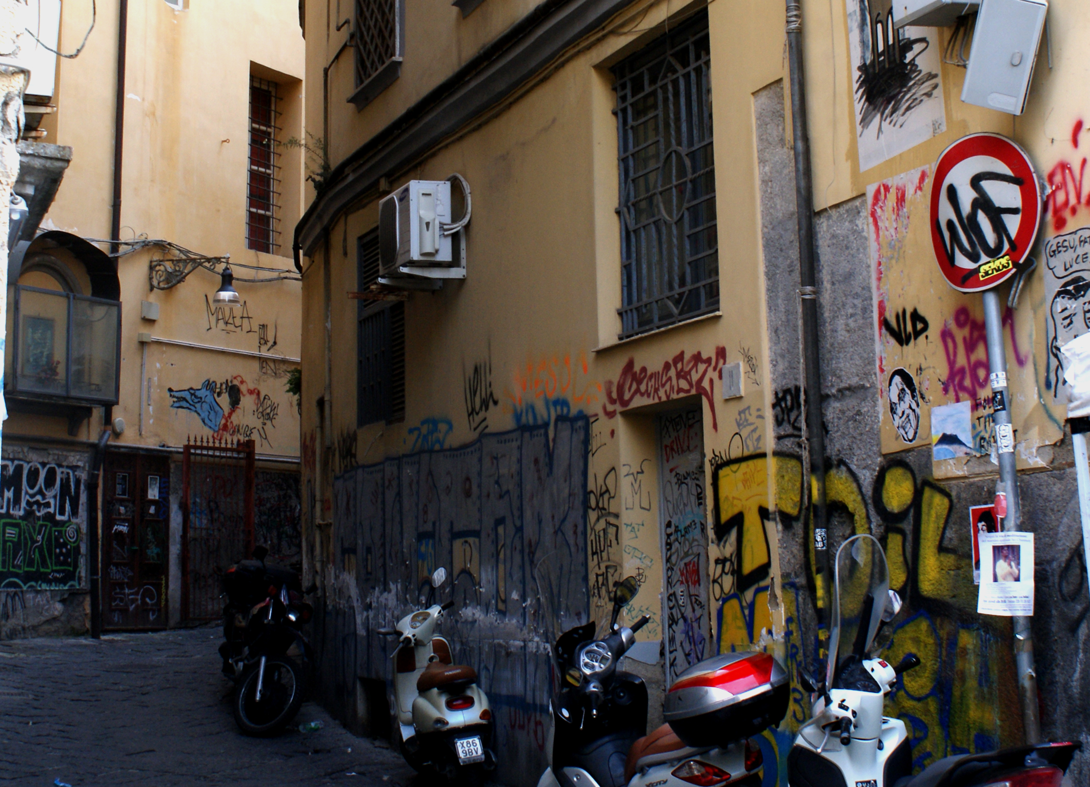 Questo è uno dei vicoli che sbucano sulla strada del Conservatorio di Napoli, è caratteristico trovare murales e disegni sui muri e per le vie del centro. Queste stradine strette e spesso scure danno un senso di riservatezza e forse protezione a chi si ritrova passeggiare per questa zona.