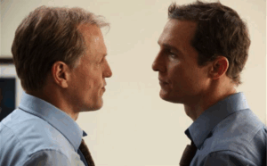 I due protagonisti non potrebbero essere più diversi: Marty è l’integrato, il poliziotto stimato da tutti i colleghi, buon padre di famiglia, crede nei valori del lavoro, della religione, della comunità, dell’impegno ed è al contempo incarnazione dell’ipocrisia borghese e dell’utopia suburbana (Twin Peaks ha fatto scuola…), vista la sua inclinazione al tradimento coniugale con ragazze molto più giovani di lui, all’alcolismo e all’uso disinvolto della violenza; Rusty è una figura cristologica, il dolore e la sofferenza privati (ha perso una figlia giovanissima) hanno forgiato la sua visione del mondo nichilista e antinatalista che si esplicita non solo durante l’interrogatorio cui è sottoposto nel 2012 ma anche nei lunghi e densi dialoghi con Marty durante gli spostamenti in automobile da una parte all’altra della Louisiana in cerca di indizi: sono dell’idea che la coscienza umana sia stato un tragico passo falso nell’evoluzione. Noi siamo creature che non dovrebbero esistere è la silloge del post-umanesimo alla Ligotti di Cohle, personaggio perennemente in bilico tra dovere professionale e disillusione esistenziale, senza che questo gli impedisca di essere sempre all’altezza del suo ruolo pubblico.